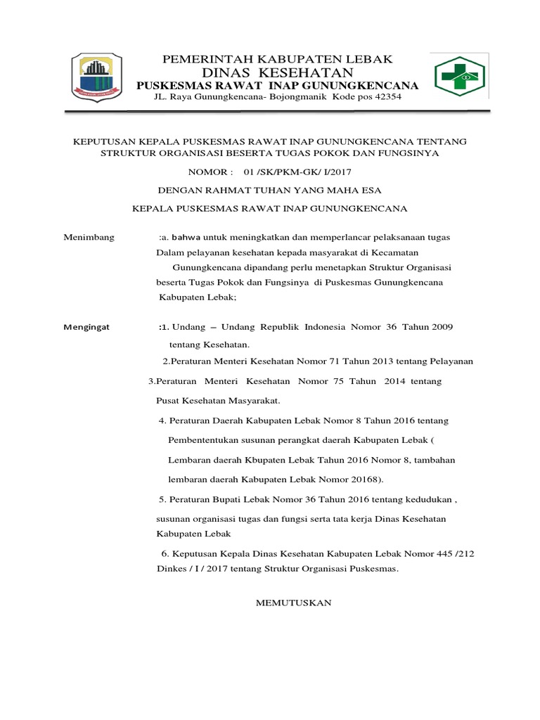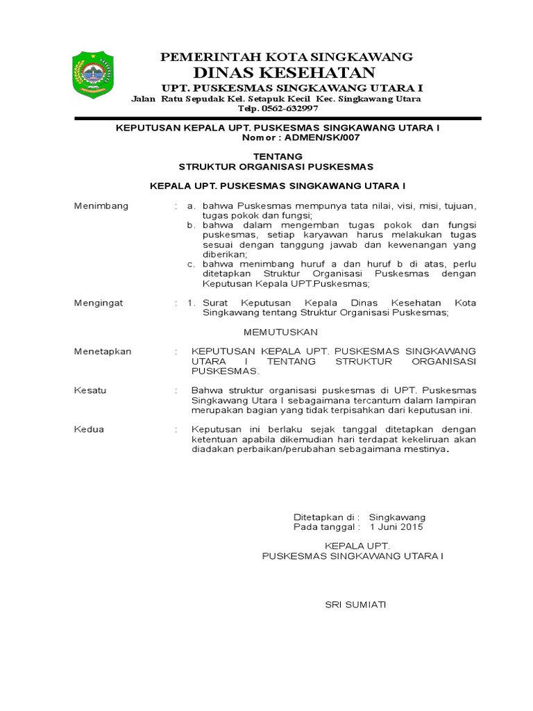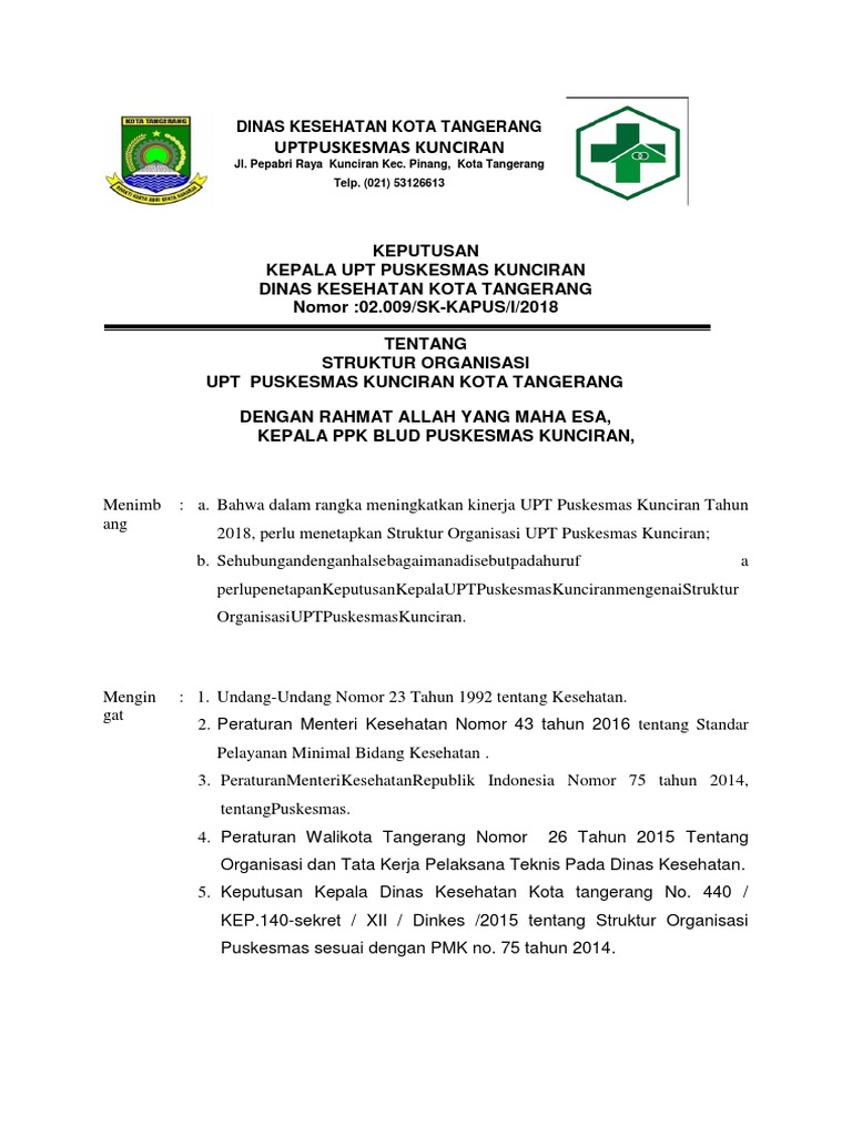 22 2 3 1 1 Sk Struktur Organisasi New from data03.123doks.com Sk kadinkes sotk puskesmas th 2017 pdf. * klik gambar untuk memperbesar. Penyusunan struktur organisasi puskesmas di satu kabupaten/kota dilakukan oleh dinas kesehatan kabupaten/kota, sedangkan penetapannya dilakukan dengan peraturan. Sk pengelolaan penanganan pengaduan pelanggan. Struktur organisasi puskesmas makale kecamatan makale disusun dengan berpedoman pada peraturan menteri kesehatan (permenkes) berdasarkan pada keputusan kepala puskesmas makale no.03/10.tu/sk/v/2015 tentang struktur organisasi puskesmas makale kecamatan. Adminpuskesmas pada puskesmas gemaharjo dukung panca program kesehatan di pacitan. Deklarasi zona integritas puskesmas gemaharjo. Kabupaten tulungagung per 1 agustus 2021.